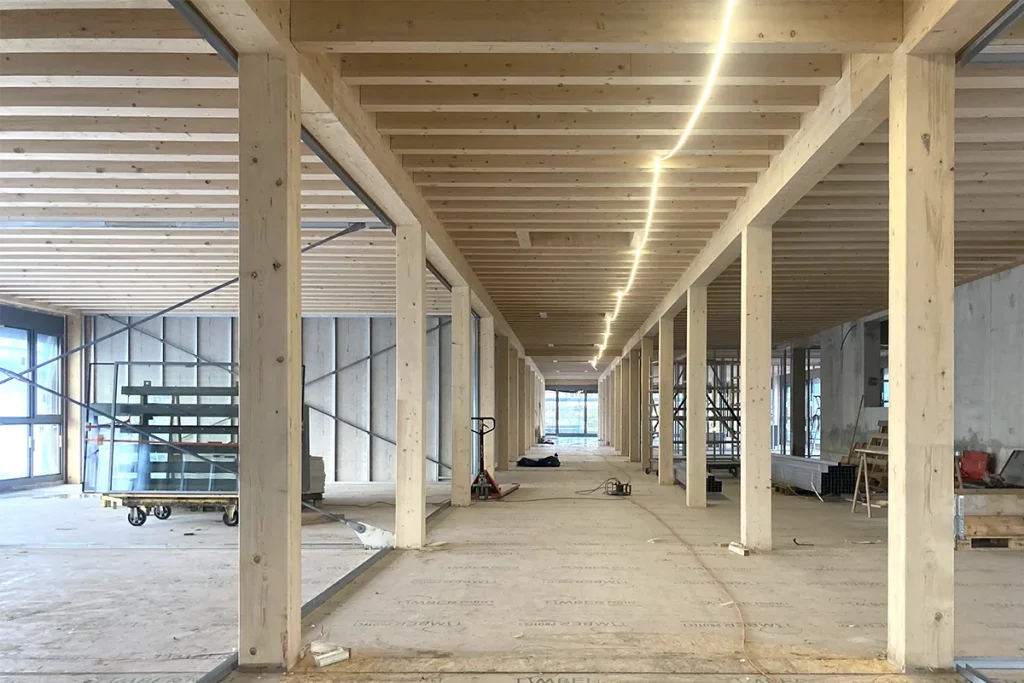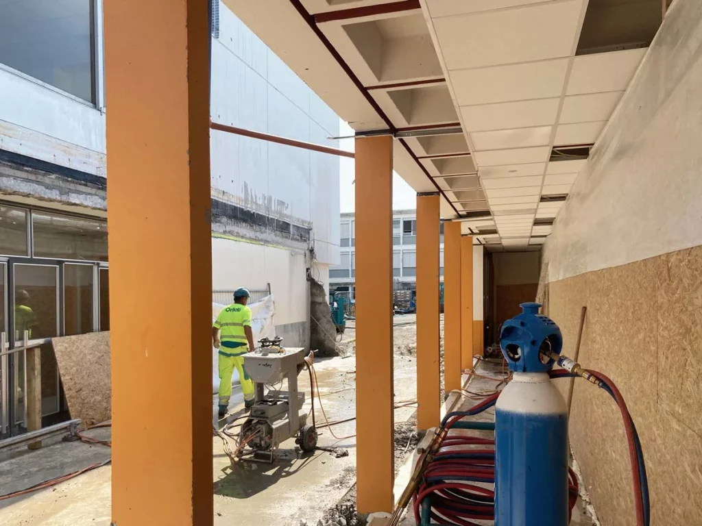 Au chantier du Cycle d’Orientation de la Golette à Meyrin, une étape importante vient d’être franchie: le démontage des échafaudages. Les façades commencent à se dévoiler et révèlent peu à peu l’identité architecturale du projet. Cette avancée marque un moment fort, où l’édifice prend toute sa présence dans le paysage urbain.