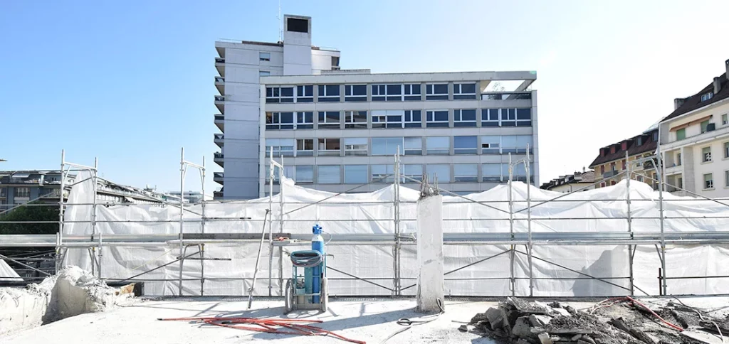 Servette démolition Rue de la Servette 93. Etage rez +2. Exactement la dalle où amosarchitectes a travaillé pendant 7 ans (2011-2018). Démolition et reconstruction en cours.
