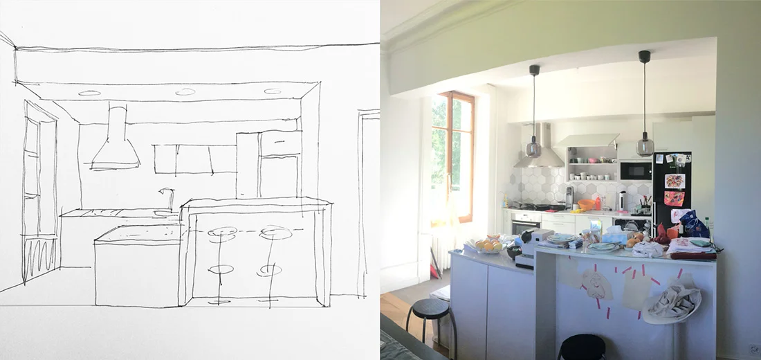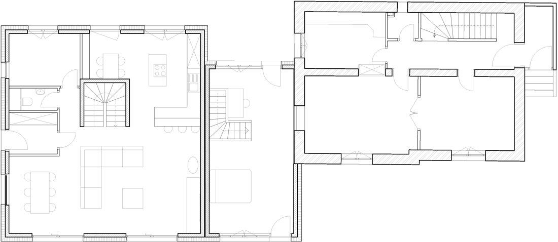 Pour compléter l’intervention, la maison ancienne a été rénovée avec la création d’une ouverture entre la cuisine et la salle à manger et l’aménagement d’une nouvelle salle de bain.