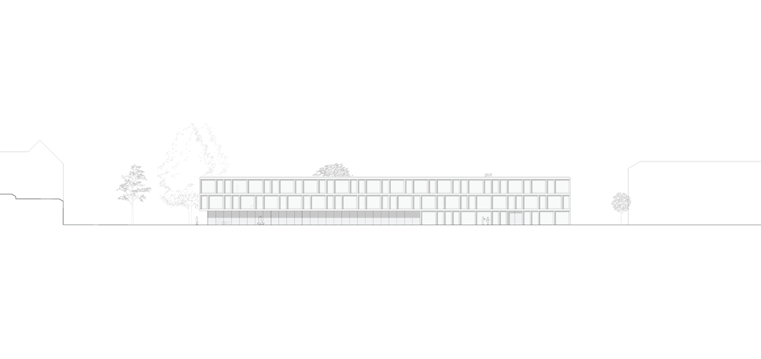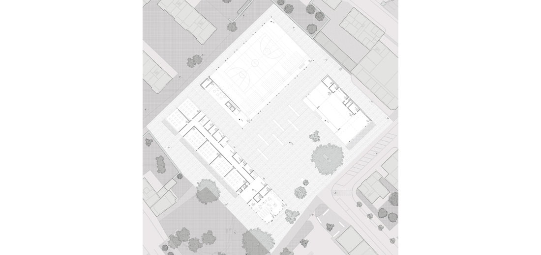 Les nouvelles infrastructures à vocation culturelle, sportive et récréative sont disposées dans trois volumes qui définissent des nouveaux espaces publics de qualité. La place créée est généreuse, mais reste à échelle humaine ; elle permet la rencontre entre le public et les activités de l’établissement scolaire et offre une ouverture du milieu scolaire à l’espace urbain qui fait la qualité des préaux scolaires suisses. L’espace de respiration et de verdure à l’angle sud-est de la parcelle est mis en valeur comme zone verte