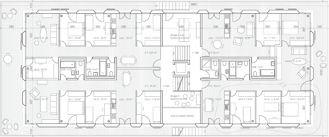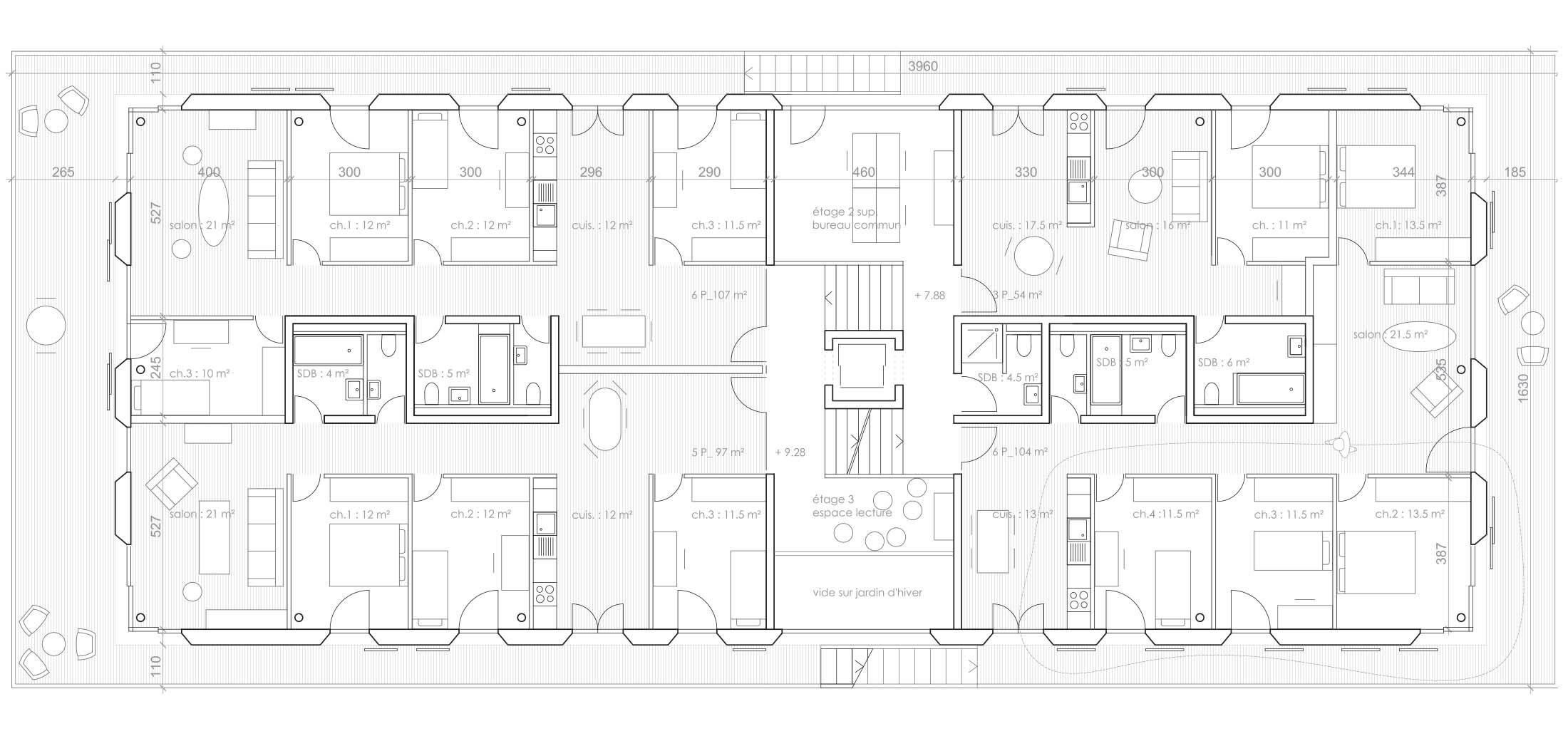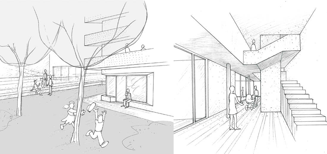 Il s’agit de conserver la privacité des habitants tout en favorisant les connections entre eux. Les degrés de privacité sont déclinés dans les appartements, mais aussi recherché dans les espaces communs. Au rez de chaussée les espaces intérieurs se prolongent vers des espaces extérieurs. Le noyau de l’immeuble est constitué de lieux de rencontre, d’espaces partagés en lien avec les escaliers. C’est une partie intégrante du programme qui participe largement au confort de vie des habitants et à la qualité de leur vie sociale.