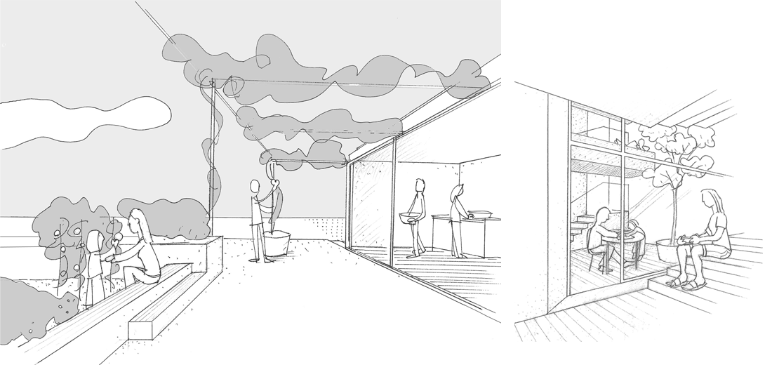 Le bâtiment de la coopérative Polygones fonctionne comme «un solitaire» dans le quartier, il est isolé et parallèle au mail. Situé à l’entrée du site, au bout de l’esplanade, le bâtiment marque un point spécifique du quartier des Vergers et génère des relations entre le haut et le bas. Le projet d’aménagement que nous proposons consiste à offrir une diversité d’espaces publics destinés à l’usage des habitants du quartier: la terrasse couverte en lien avec l’espace culturel et la salle polyvalente ainsi que le jardin légèrement en contrebas qui permet de gérer la relation spatiale avec la rue et de créer un espace vert de qualité.
