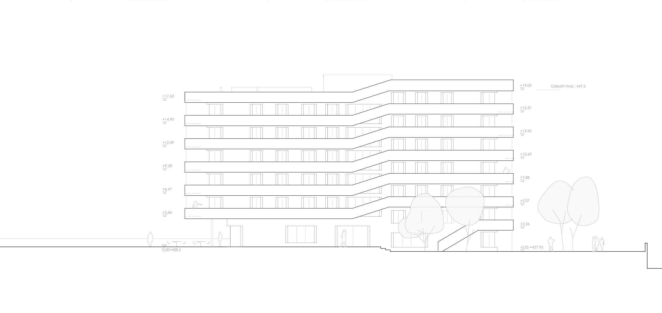 La morphologie du bâtiment en demi-niveaux induit la forme et le mouvement de la façade. Les balcons filants et continus entre étages expriment cette volonté de fluidité.