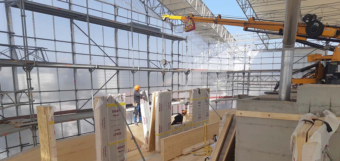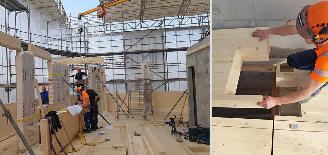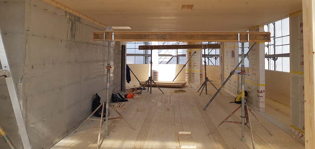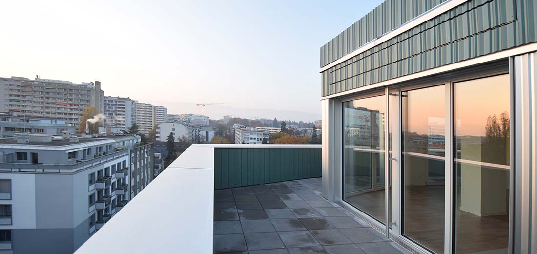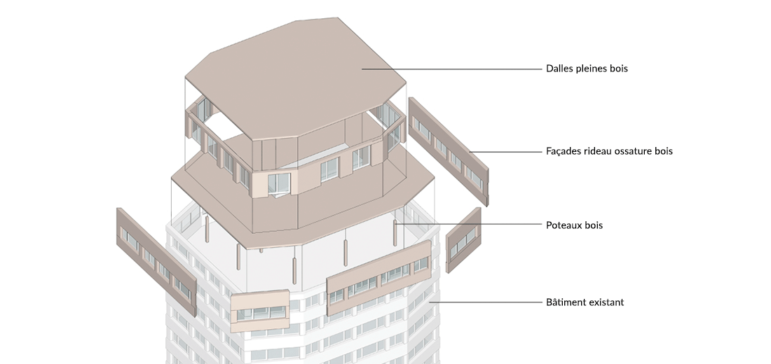 La surélévation du bâtiment permet de souligner son caractère de solitaire. La nouvelle enveloppe thermique apporte un confort supplémentaire aux locataires et une dépense énergétique largement inférieure tout en gardant le thème des bandes horizontales du projet d’origine. La mise en œuvre en bois de la surélévation permet de construire de manière légère et rapide.